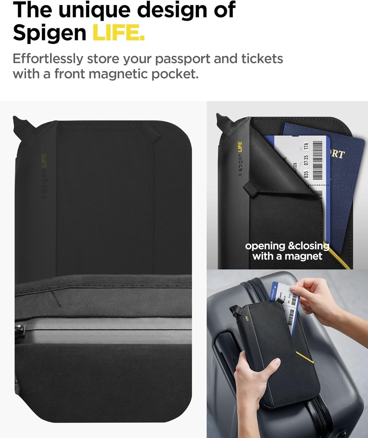 Spigen Life for Passport Card Cover Holder with RFID Blocking Technology Wallet Travel Documents Organizer Protector Accessories, SIM Card Pin Included(Black – with AirTag Holder)