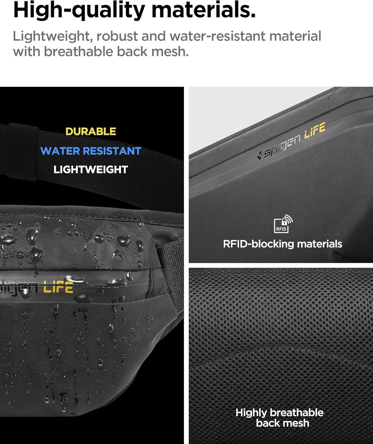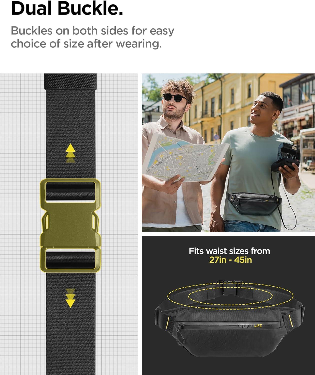 Spigen Life Fanny Pack for Passport Holder, Secure Hidden Travel Wallet with 4 Separate Pockets, Waist Bag, Water Resistant, Durable, Crossbody Bag with Adjustable Strap for Travel, Hiking, Sports(Waist Bag)