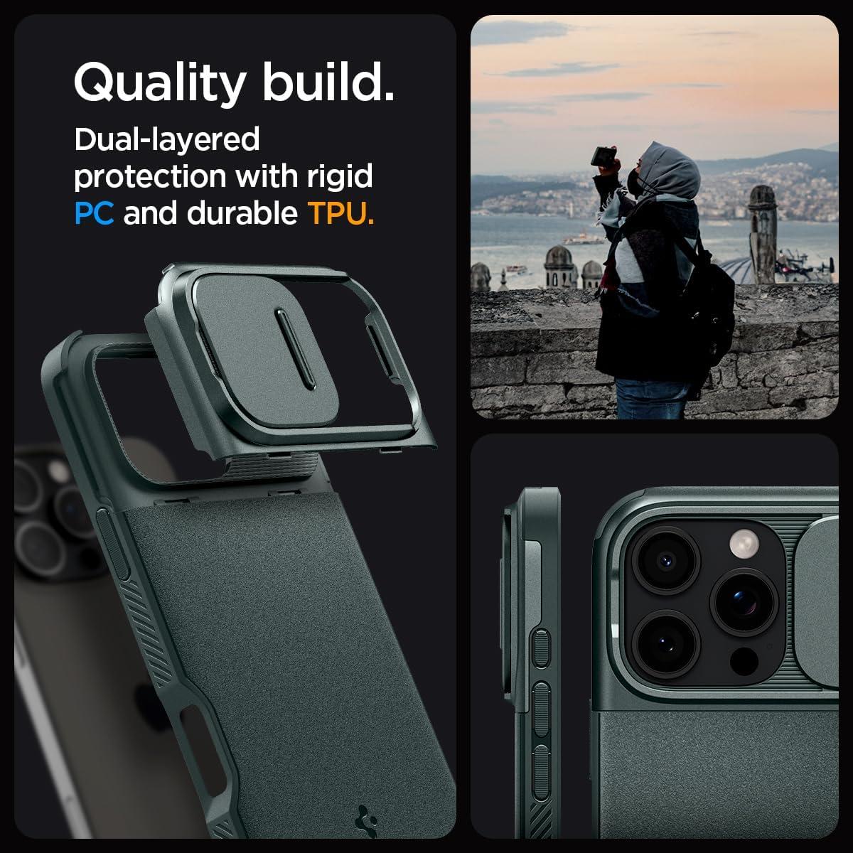 Spigen for iPhone 17 Case, Optik Armor MagFit [TPU Covered Camera Control] [Camera Cover/Kickstand] [Compatible with MagSafe] – Abyss Green(Abyss Green)