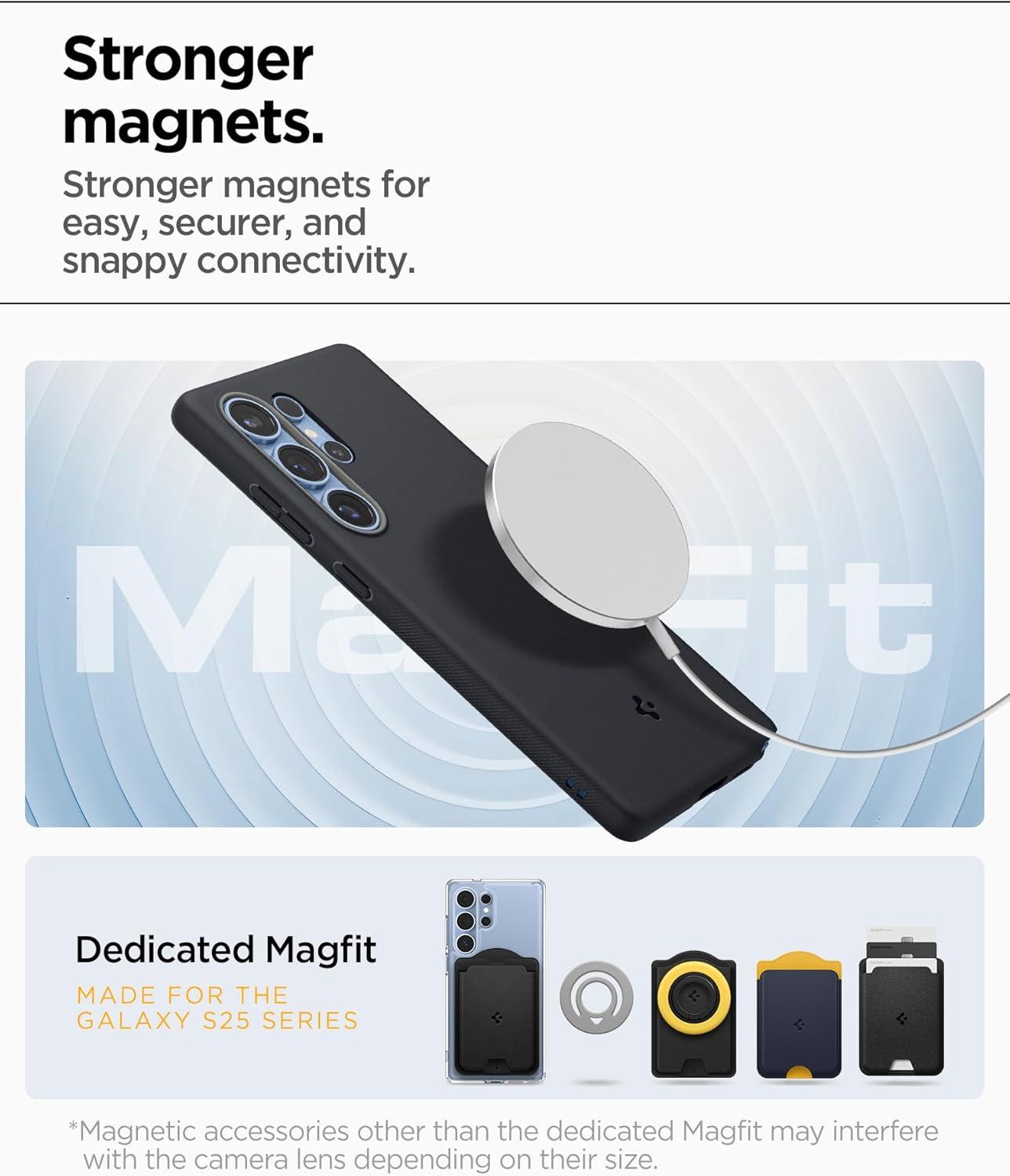 Spigen magnet cases designed for S25 Series might not be fully compatible with MagSafe wallets designed for iPhone.