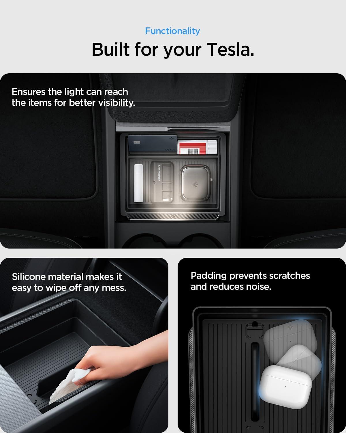 Spigen Non-Slide Center Console Organizer (Expanded Capacity) for Tesla Model Y Juniper (Only Premium & Performance 2025/26) and Model 3 Highland (Standard, Premium & Performance 2024/25/26)(Center Console + Armrest Organizer Bundle)